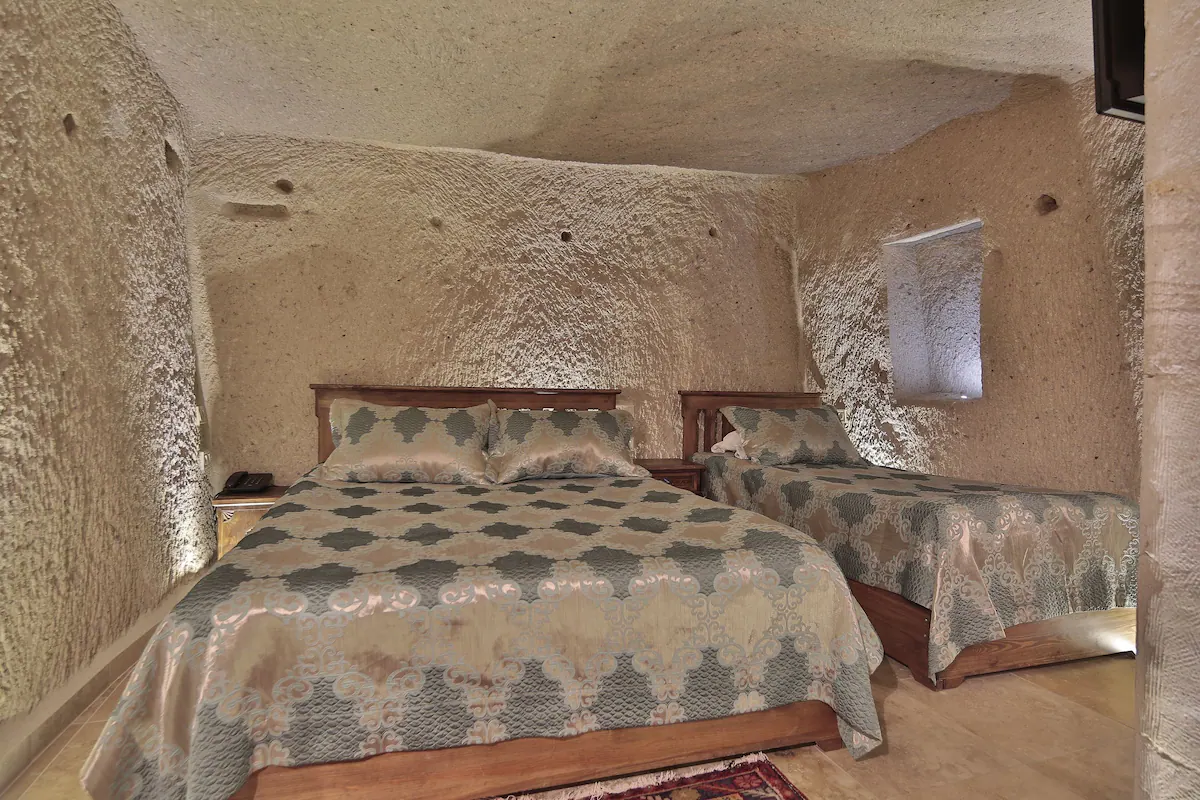Our Standard rooms are cozy and comfortable, perfect for solo travelers or couples looking for a romantic getaway. Each room is carved into the natural rock formations of the Cappadocia region, providing a unique and authentic experience. Relax in the comfortable queen-sized bed and enjoy the natural temperature control of the cave walls. The room is equipped with modern amenities, including a private bathroom and shower, flat-screen TV, and free Wi-Fi. You'll feel right at home in our Standard rooms, with everything you need for a comfortable and unforgettable stay in Cappadocia.